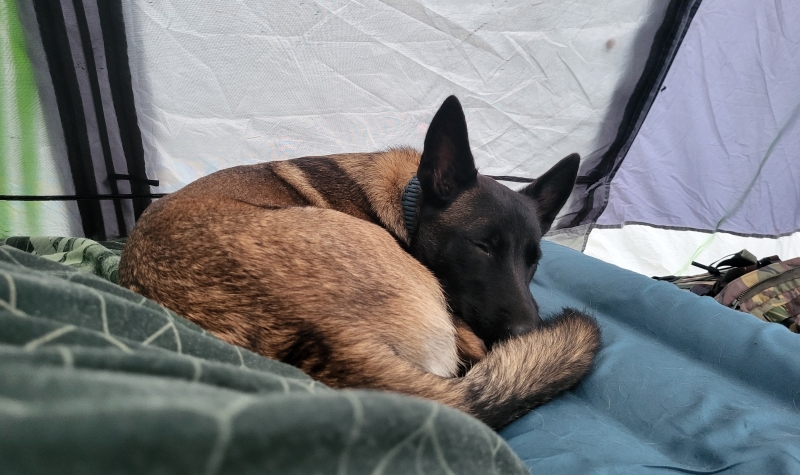 We hebben overnacht in Duitsland, vlakbij de Tsjechische grens. Tikkie mocht bij ons in de tent slapen, en dat was voor haar een totaal nieuwe ervaring. Karma en Znappie sliepen rustig in hun kennels, en de bus stond uiteraard direct naast onze tent. ’s Ochtends hebben we eerst heerlijk gewandeld en daarna het laatste stuk naar Tsjechië gereden. Onderweg hadden we nog een beetje pech: de bus leek koelvloeistof te lekken… Gelukkig heb ik een handige partner, want met drie honden is een vervangende auto of het openbaar vervoer geen optie!