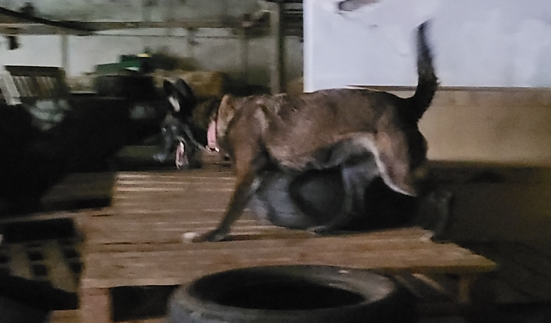 Dan begint het trainen echt! We startten in een grote loods, gevuld met pallets, autobanden, een grote flessenbak, strobalen en allerlei andere rommel. Kortom: geweldig. Bij de eerste oefening moesten de honden hoog klimmen over pallets, banden en strobalen, dan weer via plankjes omlaag en op grondniveau het slachtoffer vinden en verwijzen door middel van blaffen.