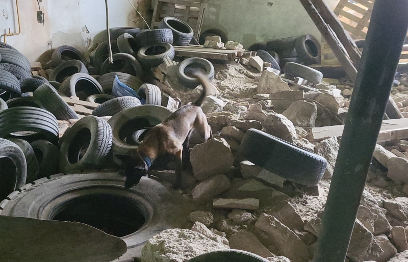 Onze derde trainingssessie vond plaats op het puin. Vooral op puin is het erg belangrijk dat je hond fysiek in orde is, in goede conditie, en dat hij ook oplet waar hij loopt. Op het puinterrein konden we de oefeningen makkelijker of juist moeilijker maken door met de windrichting te spelen. Het slachtoffer onder een beschutting leggen waarbij de wind wel in blaast, maar vervolgens terugkaatst terwijl de hond alleen van de andere kant het verstek kan benaderen: dat zijn de puzzels waarmee we de honden uitdagen!